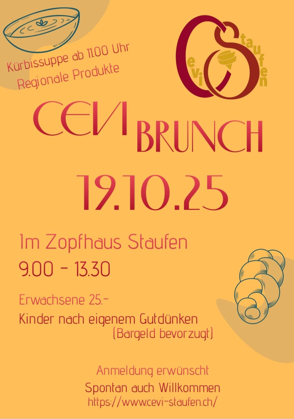 Hast du Lust auf einen Earl-Gray Tee oder Kaffee, mit Gipfeli, Brot und Gonfi? Dann komm vorbei an unser Cevi-Brunch am 19. Oktober im Zopfhuus. Ab 11 Uhr gibt es dann auch noch, passend zur Jahreszeit, feine Kürbissuppe :)) . Damit wir wissen wieviele kommen, bitten wir euch den unten eingeblendeten Anmeldetalon auszufüllen und gibt auch an, wieviele Personen mit euch dabei sind. Vielen Dank für Ihr Verständnis und wir freuen uns bekannte wie auch neue Gesichter sehen zu dürfen. :))
